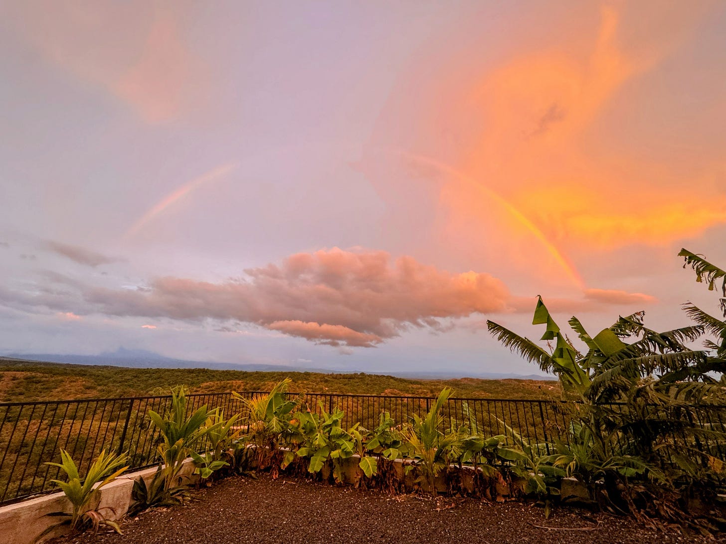 As if this whole scene weren’t already a classic end-of-a-movie cliche, a massive rainbow arched across the horizon, framing the mountains and volcanoes in the distance.