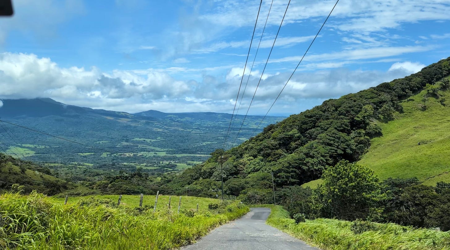 When I had first looked up these spots, the map routed us along the main highways on the flatlands, but Sarah took us down a backroad with absolutely stunning and expansive views — even rivaling breathtaking Monteverde — full of vibrant green hills and volcanic backdrops as we wound around them on the mountainside road. It reminded me of some areas of Switzerland.