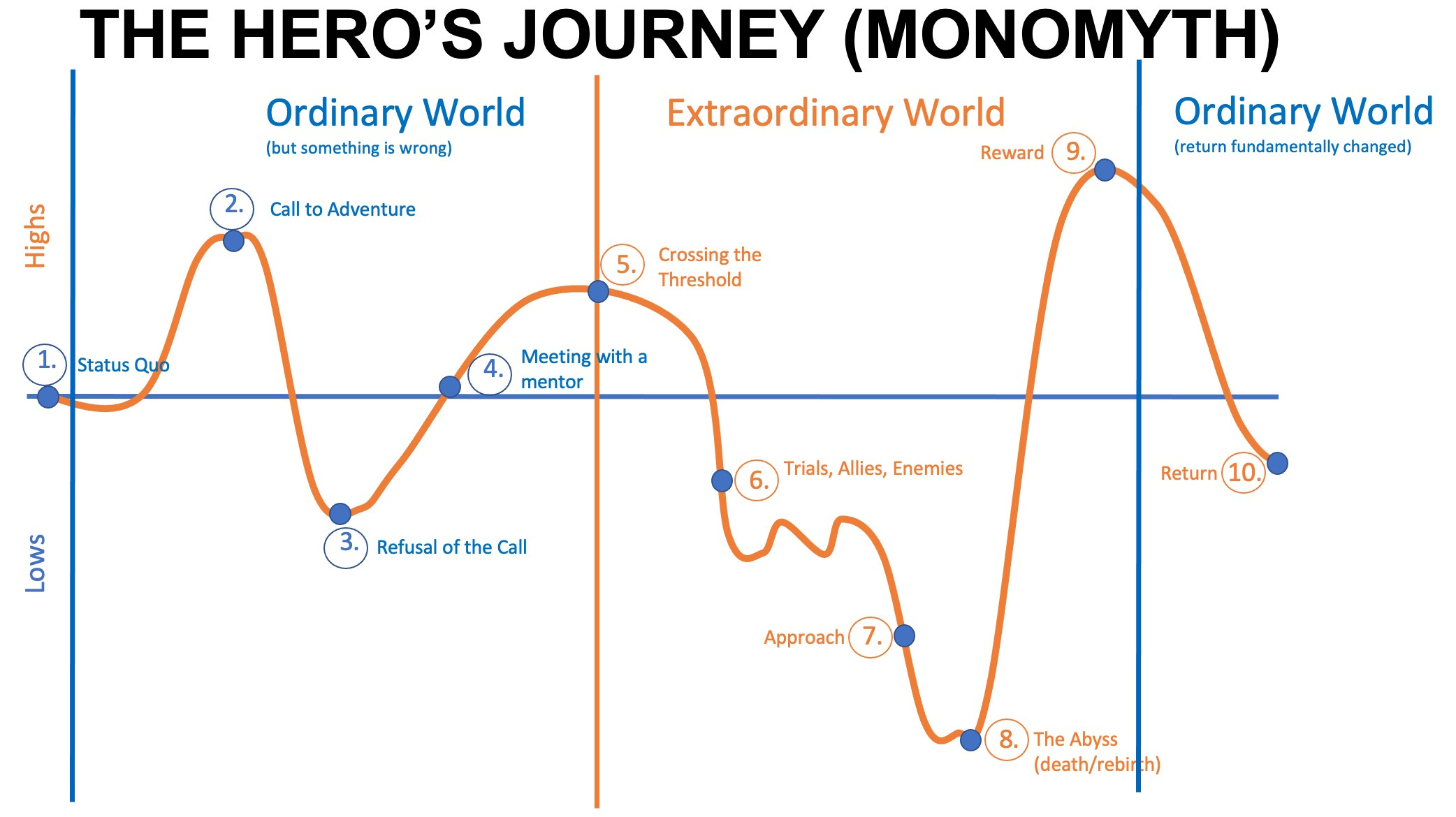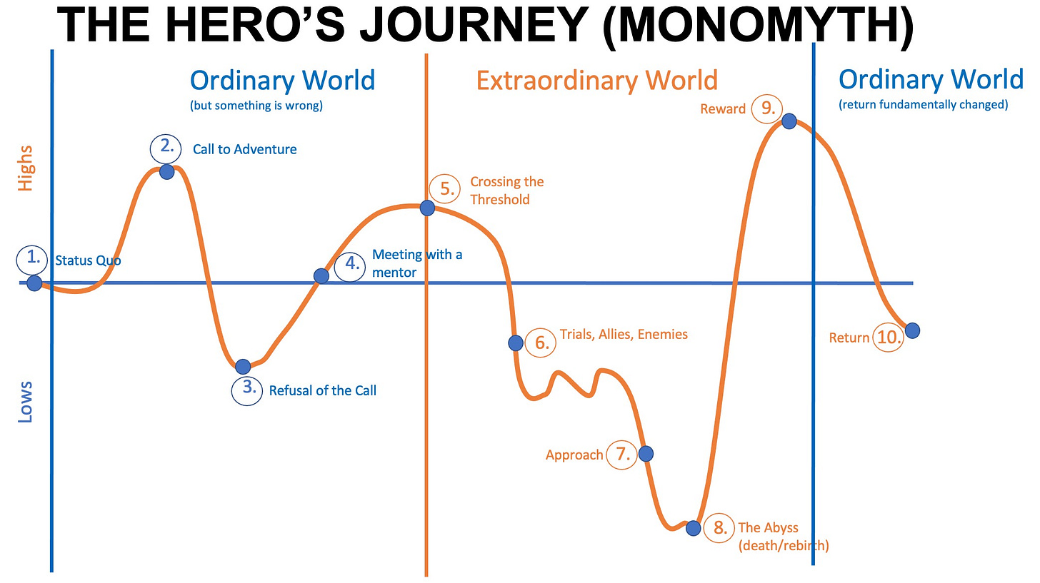 For another diversion, cuz my mind is always delving all over the place into the delves, let’s go crazy and see if we can map the trip to the Hero’s Journey, just at a high level: