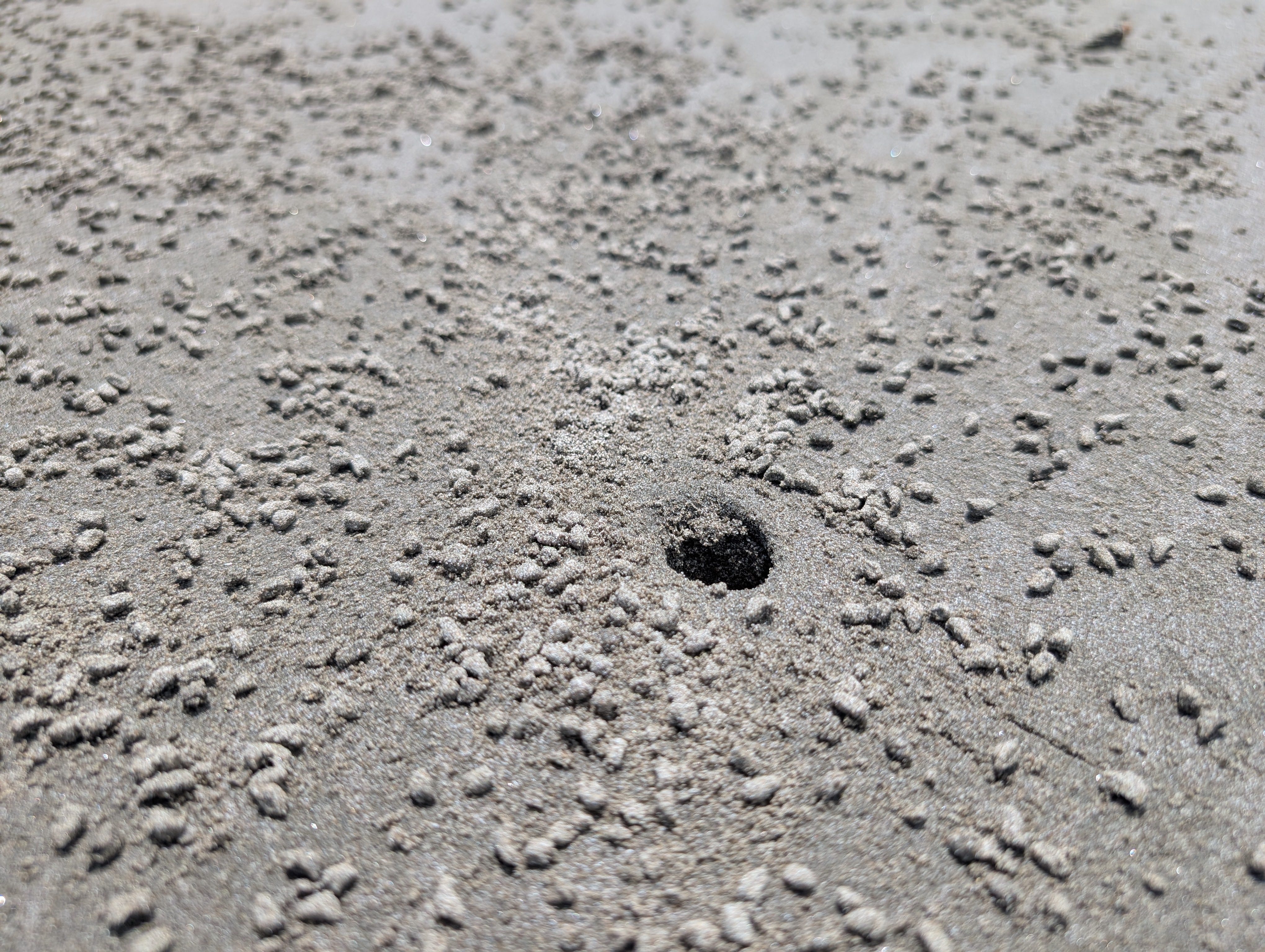 To be fair — we did have fun frolicking on the beach with the kids, diving through the waves, playing in the sand, all that classic beach day with the fam stuff. We also spotted a few little bits of wildlife that you could easily miss, but if you looked closely little shells moved around like little pill bugs at the shore, which were tiny olive snails that scoot around in the swash. You could also see quarter-sized holes from ghost crabs digging the night before. And more birds. Also I watched an ant-mimicking spider make a web on my water bottle one evening which was kinda neat.